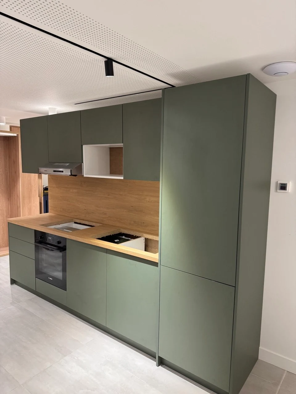 La cuisine a été posée avec un soin particulier apporté aux finitions, à l’alignement des éléments et à la qualité esthétique, afin de servir de référence pour les espaces résidentiels.