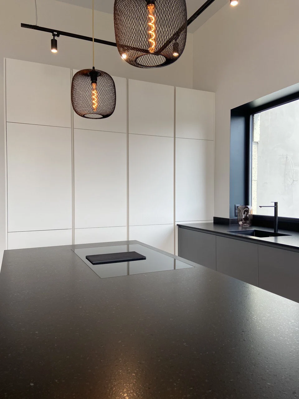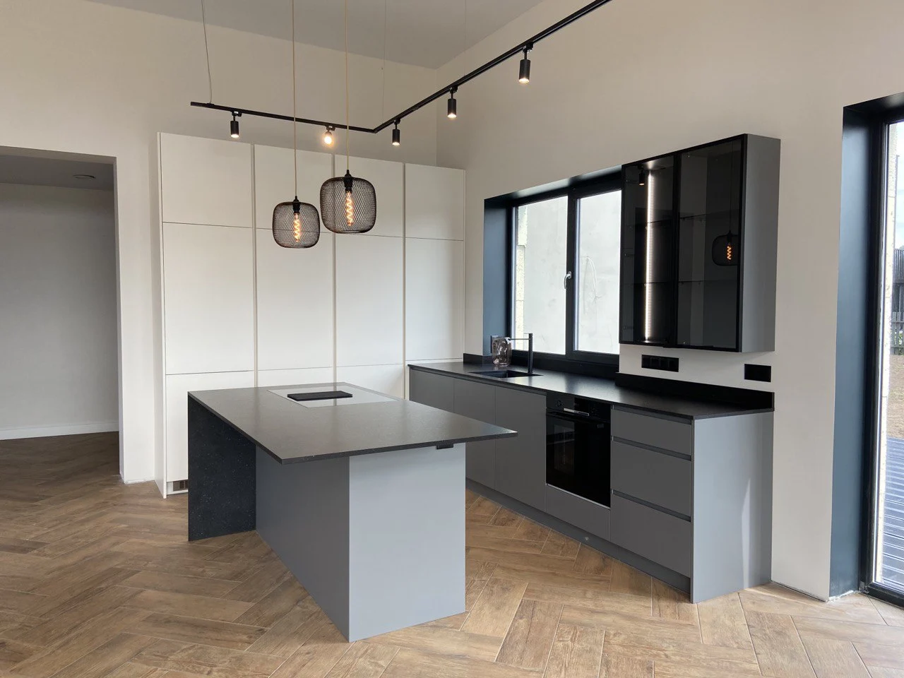 Nous vous présentons une cuisine moderne dans un style minimaliste. Les couleurs principales utilisées dans le design sont le gris et le noir. Le plan de travail est en quartz aggloméré, l’évier est placé face à la fenêtre et le rebord de la fenêtre fait partie intégrante du plan de travail.