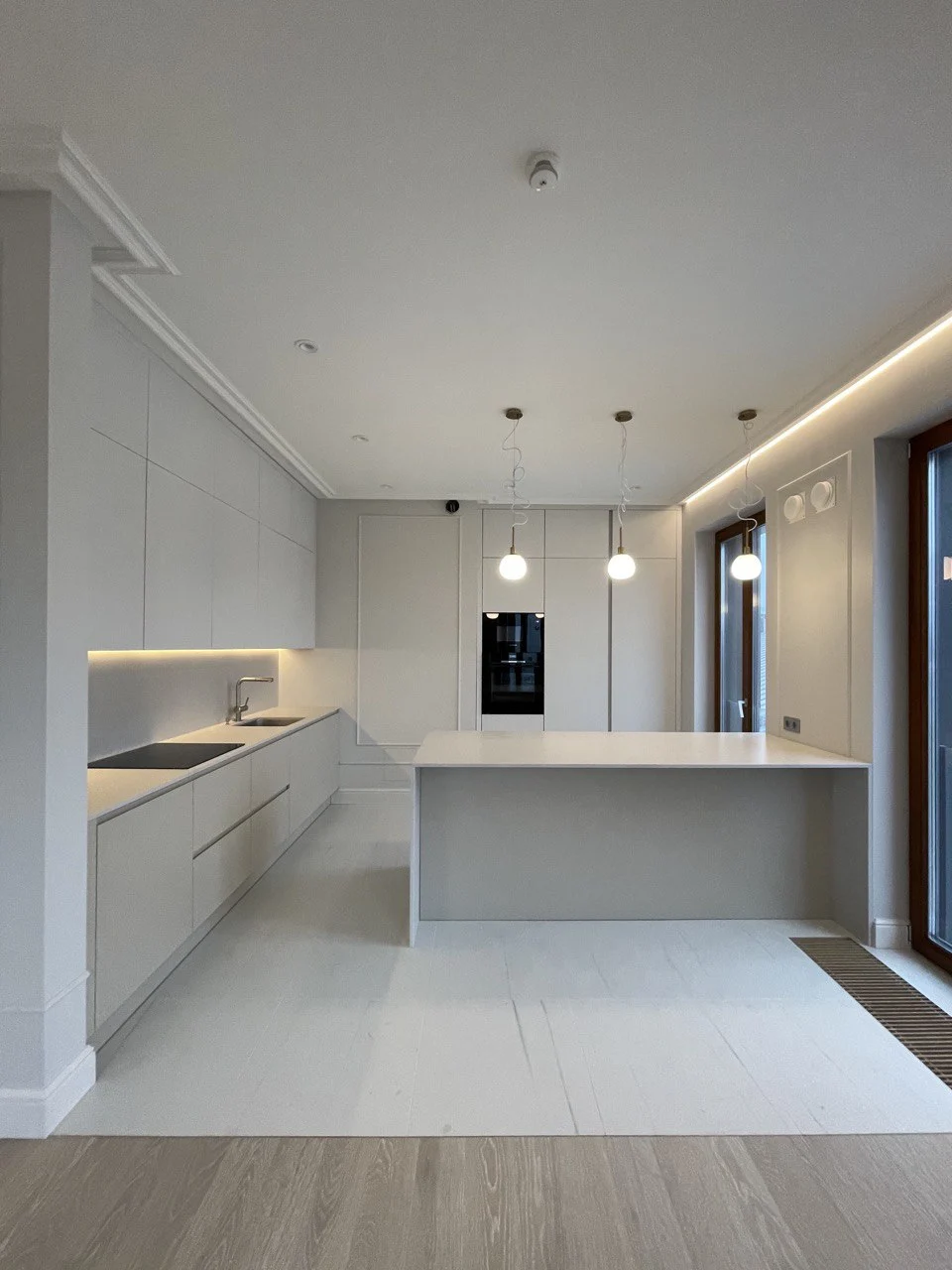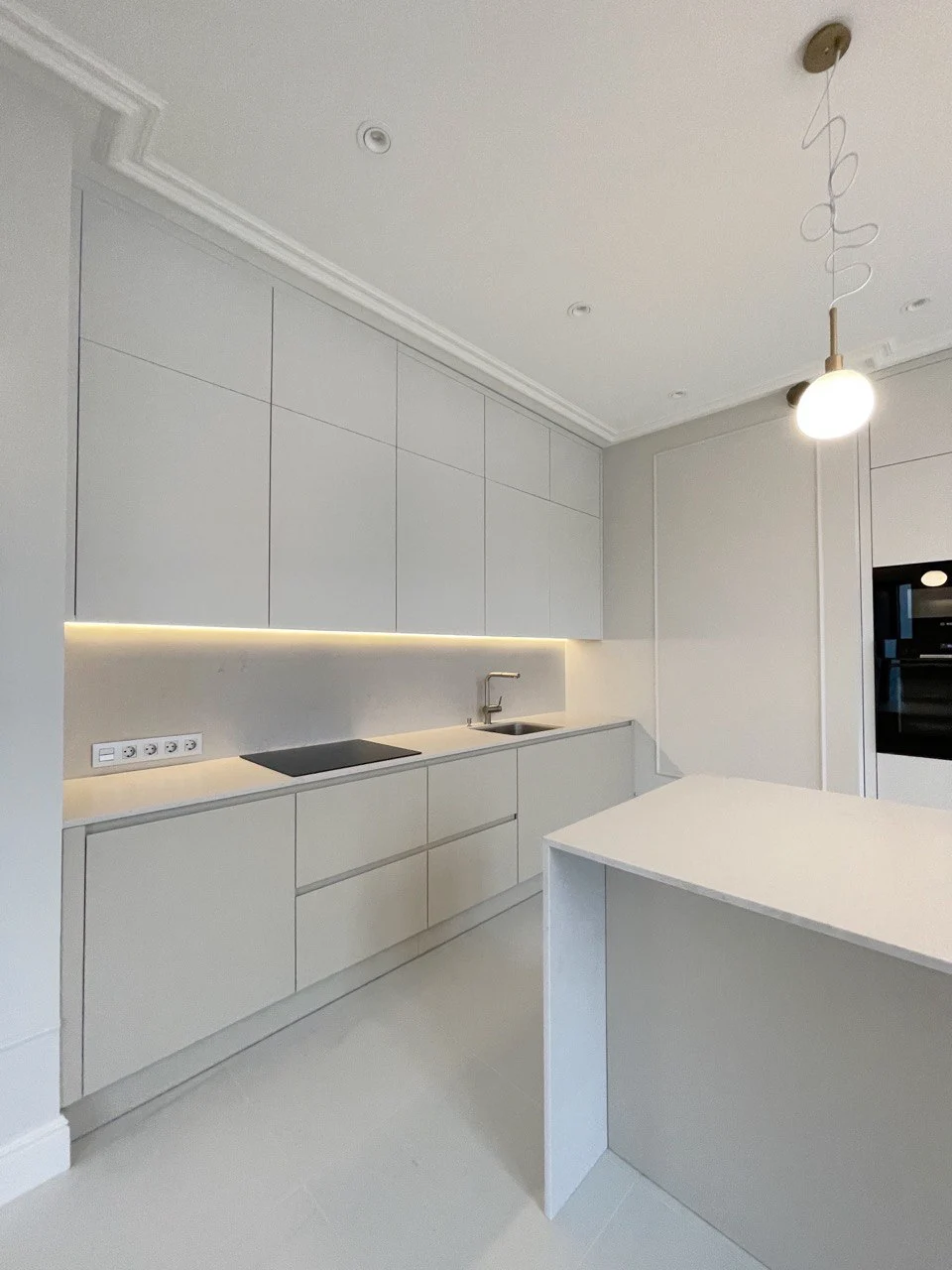 Sur la photo, une cuisine linéaire claire dans un style moderne. L’objectif principal des designers était que la cuisine s’intègre parfaitement à l’intérieur et en apparaisse comme une extension naturelle. Les façades sont en MDF laqué avec poignées intégrées.