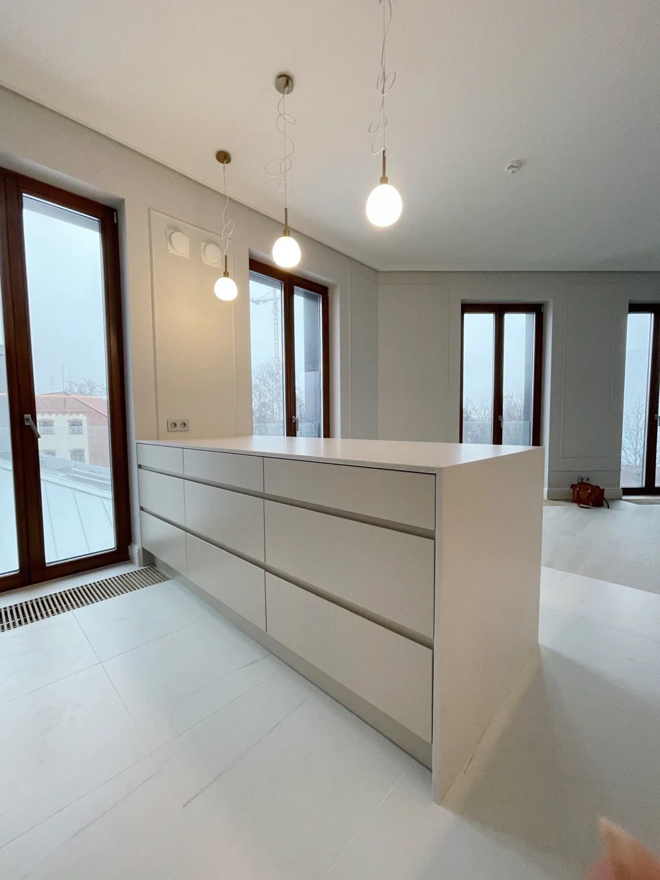 La cuisine dispose d’un îlot séparé, qui peut servir de bar, de table à manger ou de surface de travail supplémentaire. L’espace est conçu pour être maximalement fonctionnel et spacieux.